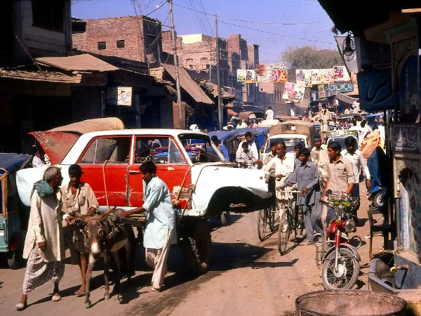Located in the backstreets of Karachi. Visual showing the world's most environmentally friendly car transport.